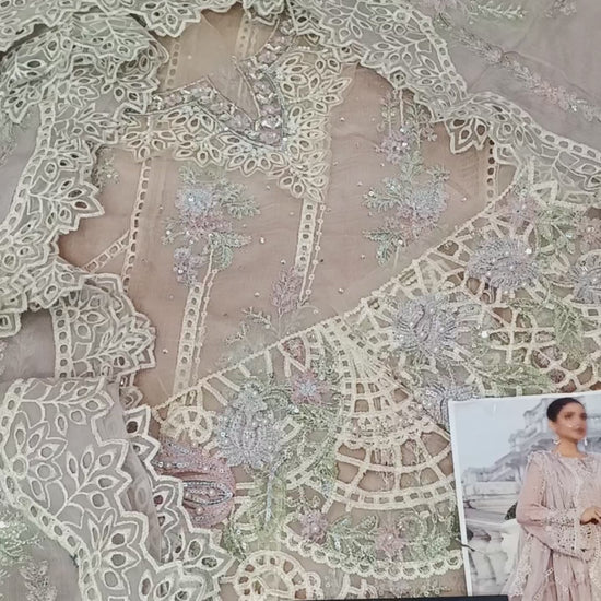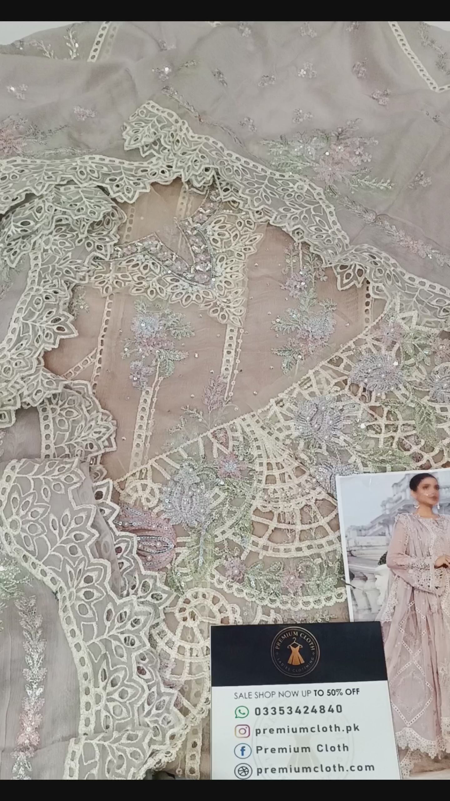 This Maria B Chiffon Collection outfit is a masterpiece of elegance and craftsmanship. The chiffon shirt features a fully heavy embroidered center panel with schiffli, sequins, and delicate hand embellishments. The neckline is adorned with intricate adda work, while the side panels and daman border showcase rich embroidery, cutwork, and bead detailing.
